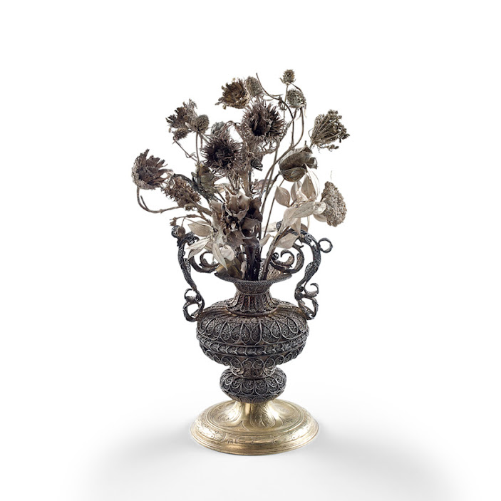 Perhaps the most remarkable features are the silver flowers which appear at first glance to be dried originals but on close inspection are silver cast from life. This is a technique employed by Jamnitzer - see the vase on the centrepiece of 1549 in the Rijksmuseum.